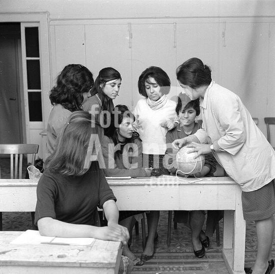 akg5314096 Völkerkunde: Sinti und Roma. Junge Frauen beim Geographieunterricht in der École Gitane de Figuerolles in Montpellier. Foto, 1961. Aus einer Serie Frankreich: "Secours sociaux - aide des etudiants aux gitans (Montpellier)" (Sozialhilfe - Studenten helfen Zigeunern).