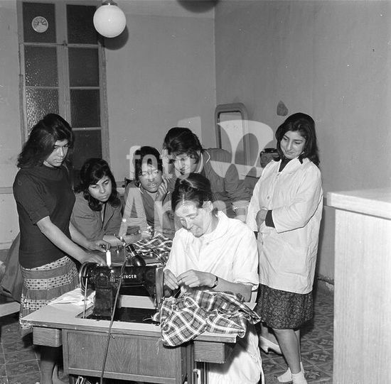 akg5314097 Völkerkunde: Sinti und Roma. Junge Frauen beim Nähunterricht in der École Gitane de Figuerolles in Montpellier. Foto, 1961. Aus einer Serie Frankreich: "Secours sociaux - aide des etudiants aux gitans (Montpellier)" (Sozialhilfe - Studenten helfen Zigeunern).