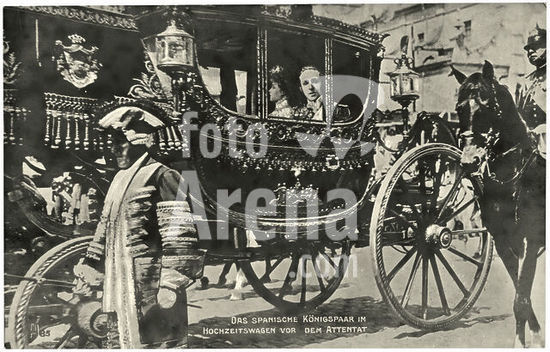 akg5421404 Alfons XIII., König von Spanien (1886-1931), Madrid 17.5.1886 - Rom 28.2.1941. - "Das spanische Königspaar im Hochzeitswagen vor dem Attentat". - Foto, 31.5.1906, Madrid. (Fotopostkarte, Hermann Hillger Verlag, Berlin). Berlin, Sammlung Archiv für Kunst und Geschichte.
