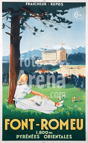 akg5542882 Font-Romeu (Gemeinde Font-Romeu-Odeillo-Via, Cerdagne, Dép. Pyrénées-Orientales, Languedoc-Roussillon, Frankreich), Grand Hotel (erbaut 1910-1913). - "Font-Romeu / 1-800 m / Pyrénées-Orientales / Fraicheur - repos". - (Dame unter einem Baum mit Blick über den Golfplatz zum Grand Hôtel). Plakat, undatiert (1930er Jahre?). Werbung der Eisenbahngesellschaft Société national des chemins de fer français (SNCF) für den Luftkurort Font-Romeu. Farblithographie, 100 x 62 cm. Grafische Gestaltung: Guena. Druck: Alépée & Cie., Paris. Privatsammlung. Author: GUENA (GRAFIKER).