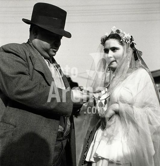 akg559363 Ethnology / Sinti and Roma. Wedding in a Roma camp in the suburbs of Paris (France): The bride's father examines the bridal jewelery. Photo, 1938, by Denise Bellon (1902-1999). From the series: La Zone. Un mariage Gitane. Copyright: Manipulation of image strictly forbidden.