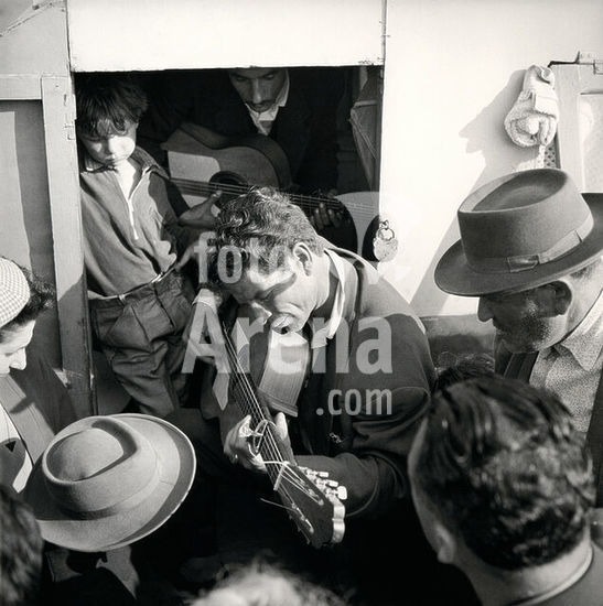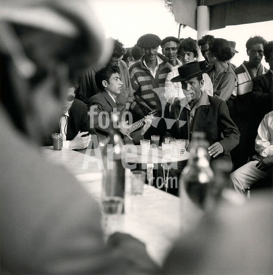 akg5877108 Völkerkunde: Sinti und Roma. Musiker auf der Terrasse eines Lokals in Südfrankreich mit Zuhörern. Foto, 1965. Aus einer Serie "Les gitans. Chants, musique, danse". Copyright: Full credit line mandatory © Paul Almasy  /  akg-images.