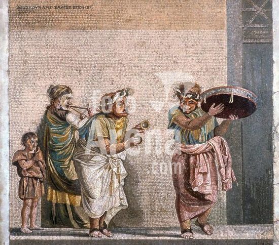 akg602862 Roman floor mosaic. 1st Century B.C. Musicians. Mosaic by Dioscurides of Samos after a painting. From the house of Cicero in Pomppeii. Naples, 41.5 × 43.5 cm. National museum (Campania, Italy).