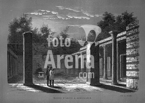 akg603149 Herculaneum (Italy), House of Argos. Drawing of the peristyle of the House of Argos (Casa d'Argo) with visitors (1855 by Ernest Breton). From the book Pompeia by Ernest Breton. Private Collection.