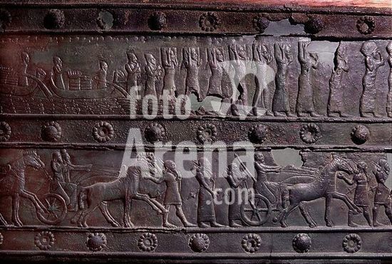 akg609623 The wooden gates of Shalmaneser III with bands of relief decoration in bronze. The top detail shows porters and Assyrian officers. The bottom detail shows the Assyrian army leaving the camp to assault the city of Khazazu. Country of Origin: Ancient Middle East. Culture: Assyrian. Date / Period: Late Assyrian, c. 853 BC. Place of Origin: Balawat,.