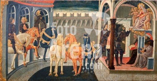 akg613912 Scheggia, born Giovanni di Ser Giovanni; 1406-1486. "Pheme chooses a leader", Mid 15th Century. Tempera on wood, 43 × 84 cm. Inv. no. 9923. Florence, Palazzo Davanzati. Museum: Florence, Palazzo Davanzati.