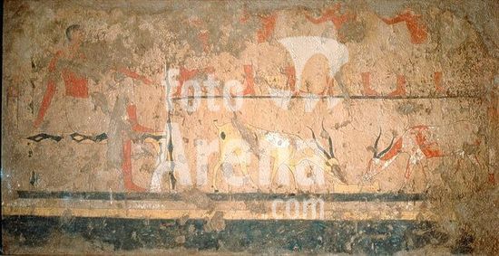akg615731 Detail of a painting from the tomb of Ity. Domesticated antelopes are feeding. Country of Origin: Egypt. Culture: Ancient Egyptian. Date / Period: 1st Intermediate /c. 2181-2040BC. Place of Origin: Gebelein. Material Size: Painting on limestone.