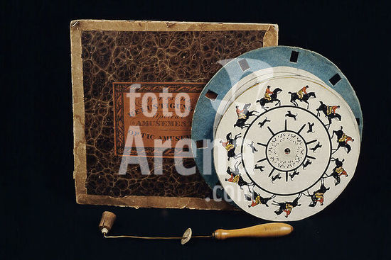 akg7075619 Optical game based on strobe effect of cardplate disc with holes, stroboscope game cardboard wood brass ivory box, In rectangular box of which only the top and bottom are still present, there are number of disks is light blue and has around each other fixed distance of ten rectangular ( look) holes; round hole in the center of the disk. The manual of the game is printed in three languages around this hole. There are also twelve smaller discs with all-around, constantly staggered plates. This game includes holder: handle with rod to which the blue disc with holes and disc with plates are attached. By making the disks rotate quickly and at the same time looking through the holes in mirror, the illusion of movement is evoked. The top of the lid of the box is brown marbled; in the middle an orange label printed label: Optical belustigungen - Optical amusements - Optic amusements optica toy strobe Nipkow disc play.