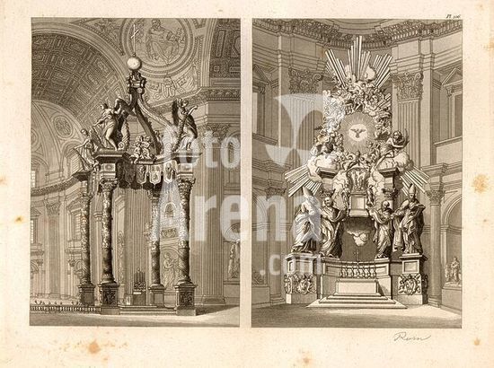 akg7680665 Canopy and altar in the St. Peter's Church in Rome, Altar and canopy over Peter's tomb in St. Peter's Basilica, pl. 106, after p. 200, fol. 106r, Carl August Menzel: Die Kunstwerke von dem Alterthum bis in die Gegenwart [...] oder Wegweiser durch das ganze Gebiet der bildenden Kunst [...]. Bd. 2. Leipzig: J. A. Romberg's Verlag, [18--].