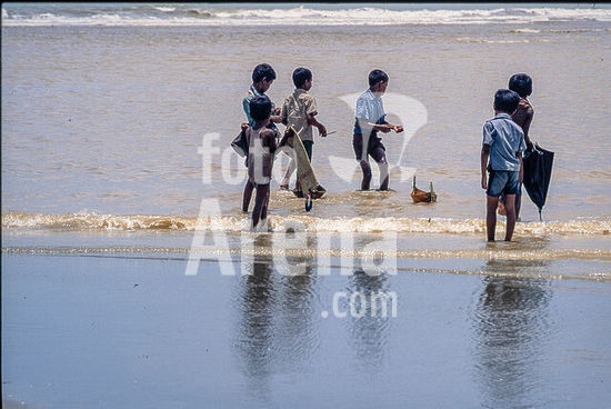 akg7744433 Asia / Bangladesh / people. - At Inani Beach (Ukhia Thana, Coxe's Bazar district) on the Bay of Bengal during the monsoon: the children of fishermen playing with a toy boat. - Photo, July 2011.