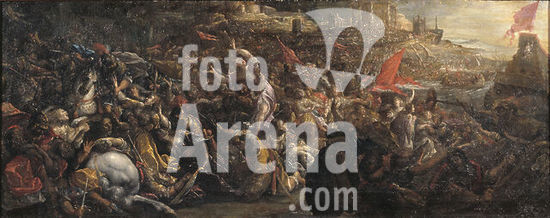 akg7767355 The Rape of the Sabines, Sabinskornas abduction, painting, 16th century, oil on canvas, Height, 43 cm (16.9 inches), Width, 110 cm (43.3 inches).