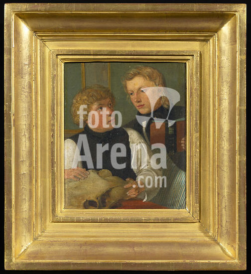 akg7913063 SPECKTER, ERWINHamburg 1806 - 1835 - attributedDouble Portrait of the Young Painter Carl Julius Milde (1803-1875) and Friedrich Nerly (1807-1878). Before 1823. Oil on canvas. 24 x 19cm. Framed. Literature: Neuhaus, Julia M.: ""Vom Kuhhirten zum kleinen Grafen"". Friedrich Nerlys Begegnungen mit Künstlern und herausragenden Persönlichkeiten in Hamburg, Rom und Venedig. In: ""Römische Tage -Venezianische Nächte. Friedrich Nerly zum 200. Geburtstag"". Catalogue for the exhibition in Dessau, Lübeck and Paderborn 2007/2008, ed. by W. Morath-Vogel, p. 12 ill. 1. The two young painters are sitting together and are engrossed in their anatomic studies. One of them is holding a book in his hands, the other is holding a horse's cranial. Another painter friend, who is practicing portraying and puts special emphasis on perspectives and the folds of the clothes, has recorded this scene. This situation leads us into the early 19th century and shows us a young Hamburg circle of friends of which some became important painters. In 1818 Johann Michael Speckter, the father of this scene's painter, and Heinrich Joachim Herterich, the uncle of the depicted Friedrich Nerlys, founded the first North German stone printing in Hamburg, where the young Nerly was an apprentice. Since his father passed away very early he was furthermore received as a family member and also joined Speckter's children Erwin (1806-1835) and Otto's (1807-1871)) circle of friends. Later he said that this was his ""golden age"". Here he also met the later painters Carl Julius Milde (1803-1875), Julius Oldach (1804-1830), and Adolf Vollmer (1806-1875). In her catalogue contribution for Nerly's jubilee exhibition Julia Neuhaus describes this period in reference to the present painting: ""The father Speckter's copper engraving collection offered a lot of visuals and this was also where Nerly got to know his later teacher and mentor Carl Friedrich von Rumohr. (...) At the Speckters' the boys drew and studied together very much; this is very well illustrated in the painting by an unknown artist. In this work two of the boys, being the young Friedrich Nehrlich and Carl Julius Milde, contemplate an animal's skull and at the same time a book with (animal) anatomic studies."" A contemporary work on canvas by Erwin Speckter, which is very comparable to our painting, portrays the four friends of youth, E. and O. Speckter, Milde and Nerly, and is recorded in a Hamburg private collection according to literature (cf. ill., from: Pauli, Gustav: Die Hamburger Meister der guten alten Zeit, Munich 1925, ill.48). Soon Erwin Speckter, Milde and Nerly travelled over Munich to Italy. This is where they parted company; however, they kept up the correspondence with each other for all their lives. Whereas Nerly found his home in Venice, Milde worked in North Germany again later on; Speckter established himself in Rome from 1830 on and got in with the Nazarenes.