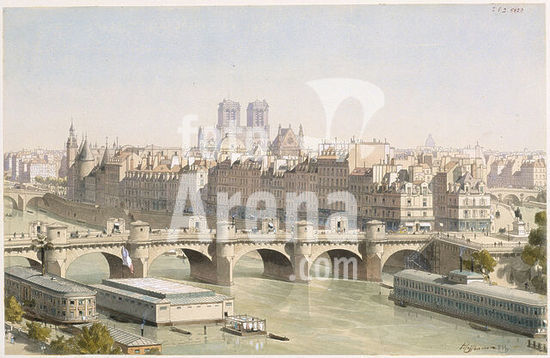 akg7967487 Hoffbauer, Fédor (Neuss, 1839 - Paris, 1922). Vue de l'île de la Cité et le pont-Neuf avec ses boutique, vers 1840.. Dessin. D. 5820, Paris, Musée Carnavalet.