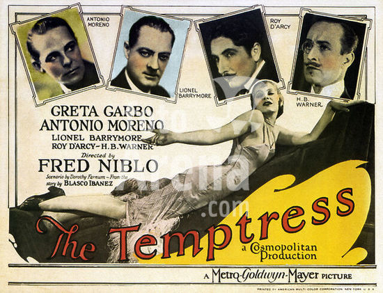 akg8763383 CINEMA Poster for the film "The Temptress", directed by Fred Niblo (Frederick Liedtke, 1874 - 1948), based on "La tierra de todos" by Vicente Blasco Ibáñez (1867 - 1928). It is the second American film by Swedish actress Greta Garbo (Greta Gustafsson, 1905-1990), co-star with Antonio Moreno (Antonio Garrido Monteagudo, 1887 - 1967), Lionel Barrymore (Lionel Herbert Blythe, 1878 - 1954), Roy D ' Arcy (Roy Francis Giusti, 1894 - 1969), HB Warner (Henry Byron Lickfold, 1876 - 1958). Metro-Goldwin-Mayer, USA, 1926.