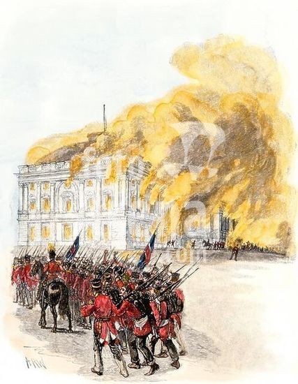 akg913188 British army burning the White House in 1814 during the War of 1812. Handcolored woodcut of a 19thcentury illustration.