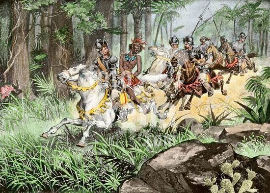 akg914632 Alonso de Ojeda captures the native chief Caonabo to bring him to Queen Isabella, 1500s. Handcolored halftone reproduction of a 19thcentury drawing by F.H. Lungren.