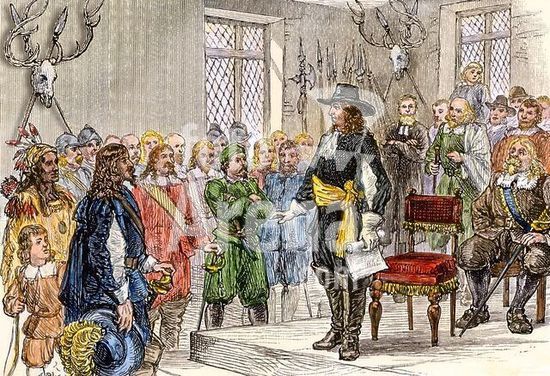 akg915320 William Penn addressing Swedish colonists at New Castle, Delaware. Handcolored woodcut of a 19thcentury illustration.