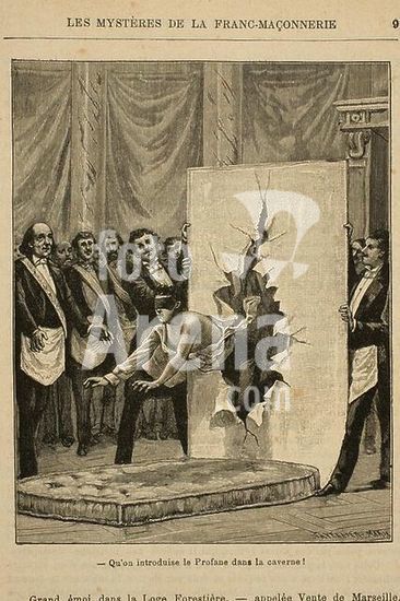 akg3696519 Geheimgesellschaften / Freimaurerei. - "Initiation du Souverain Inspecteur Général" (Initiation des 33. Hochgrads Souveräner General-Großinspekteur. Der Suchende wird angeblich aufgefordert, seine Hände in einer Schale mit geschmolzenem Blei zu waschen). - Holzstich nach Zeichnung von Pierre Méjanel. Aus: Léo Taxil, Les Mystères de la Franc-Maçonnerie devoilés, Paris (Letouzey & Ané) o. J. (1886?), S. 417. Antifreimaurerisches, in weiten Teilen fiktives Enthüllungsbuch, verfasst von Léo Taxil, eigentl. Marie Joseph Gabriel Antoine Jogand-Pagès (1854-1907), nach seiner Konversion vom Freidenker zum Katholizismus. Privatsammlung. Museum: PRIVATE COLLECTION.