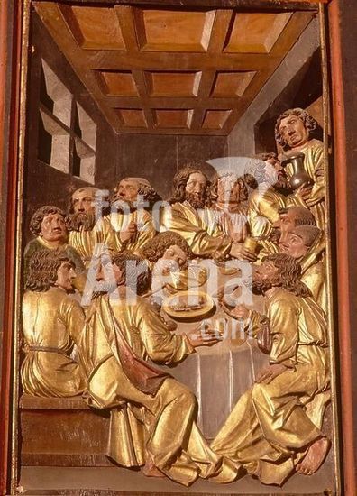akg1525474 Robbia, Giovanni della (1469-1529) und Buglioni, Santi (1494-1576). "Besuch von Gefangenen", 1525/28. Ausschnitt: Linke Gruppe. Aus dem Fries "Die Sieben Werke der Barmherzigkeit", 3.Feld. Terrakotta, glasiert, Länge des einzelnen Feldes ca. 5 m. Pistoia (Toskana, Italien), Ospedale del Ceppo, Fries über der Loggia.