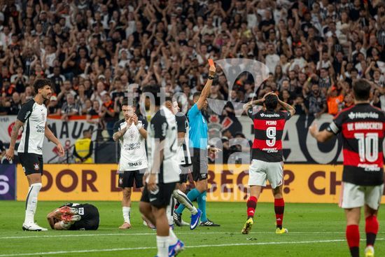 2910315 SAO PAULO, BRAZIL - MARCH 22: Arbitro Rodrigo José Pereira de Lima mostra cartao vermelho para Evertton Araujo of Flamengo durante a partida entre Corinthians x Flamengo, válida pela oitava rodada do Campeonato Brasileiro de Futebol 2026, neste domingo (22), na Neo Química Arena, SP.