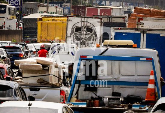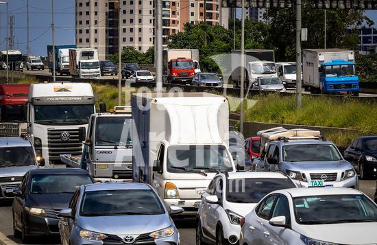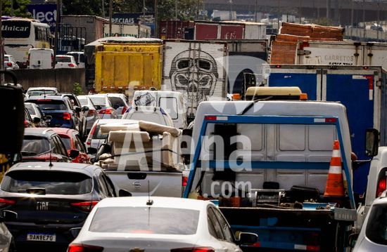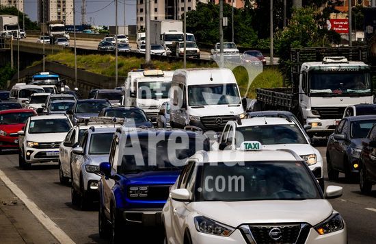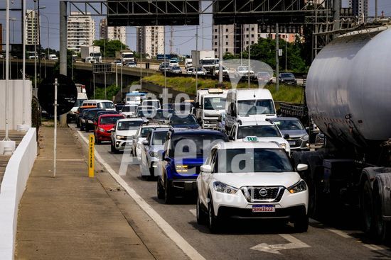 2856263 Trânsito intenso na chegada a São Paulo pela Rodovia Presidente Castelo Branco no acesso para as marginais Tietê e Pinheiros, na manhã desta segunda-feira (08).