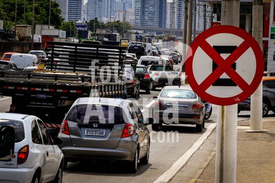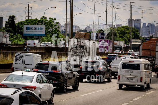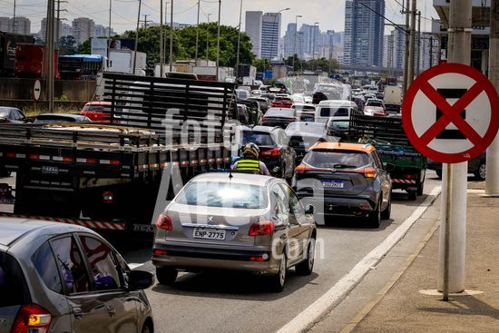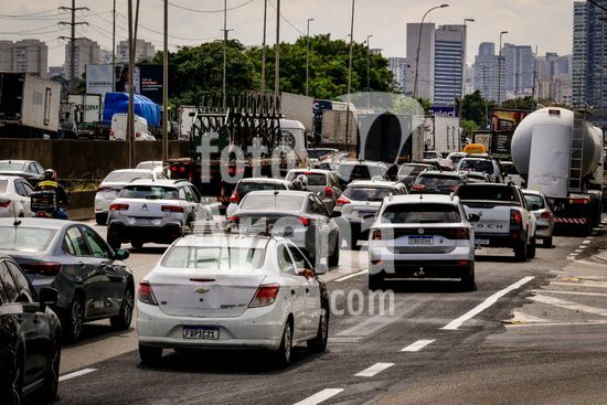 2856262 Trânsito intenso na chegada a São Paulo pela Rodovia Presidente Castelo Branco no acesso para as marginais Tietê e Pinheiros, na manhã desta segunda-feira (08).