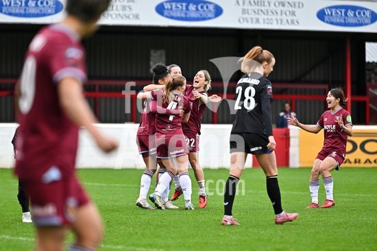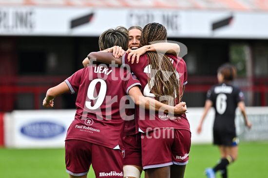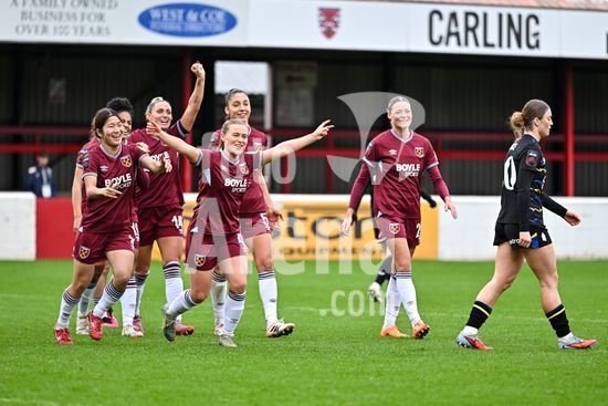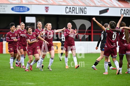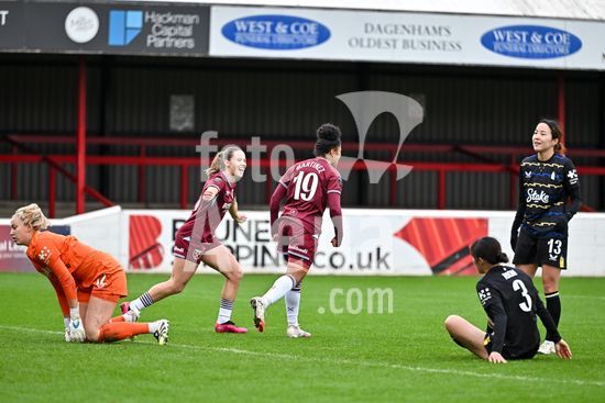 2843617 Katrina Gorry (22, capita do West Ham) comemora com suas companheiras de equipe o terceiro gol durante a partida da Barclays Women's Super League entre West Ham United e Everton no Chigwell Construction Stadium em 16 de novembro de 2025 em Dagenham, Inglaterra. (Yaroslav Dunka / Fotoarena)