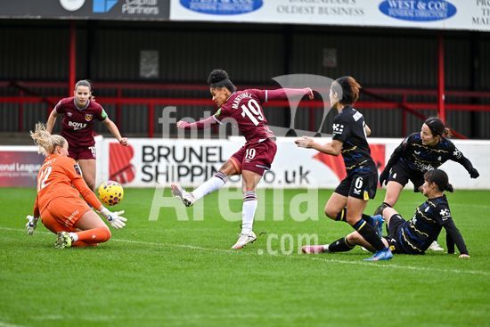 2843615 Shekiera Martinez (19 West Ham) chuta a bola e marca o terceiro gol de sua equipe durante a partida da Barclays Women's Super League entre West Ham United e Everton no Chigwell Construction Stadium em 16 de novembro de 2025 em Dagenham, Inglaterra. (Yaroslav Dunka / Fotoarena)