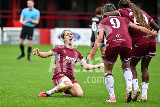 2843619 Katrina Gorry (22, capita do West Ham) comemora o terceiro gol de sua equipe durante a partida da Barclays Women's Super League entre West Ham United e Everton no Chigwell Construction Stadium em 16 de novembro de 2025 em Dagenham, Inglaterra. (Yaroslav Dunka / Fotoarena)