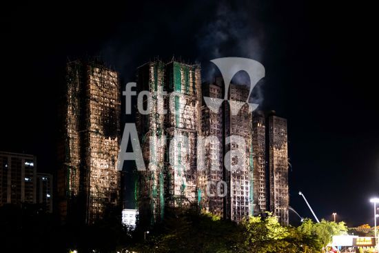 ny271125125312 Smoke rises after dark from charred buildings in the Wang Fuk Court complex in the Tai Po district of Hong Kong, on Thursday, Nov. 27, 2025. The authorities said flammable netting and foam boards may have fueled the city?s deadliest blaze in nearly 70 years, killing at least 75 and prompting arrests. (Billy H.C. Kwok/The New York Times/Fotoarena)