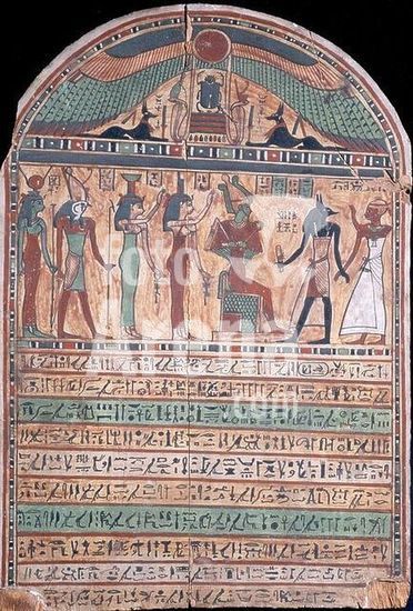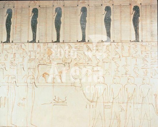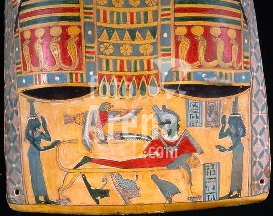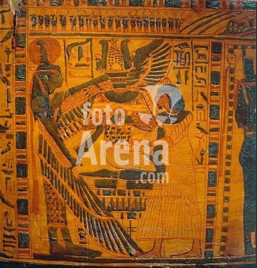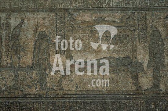 akg896195 Dendera (Dandarah) (Egypt), Hathor Temple (reign of Augustus, c.30 BC-14 AD).-Osiris' wife Isis hovering over his body as a sparrowhawk, fanning enough life into him with her wings to conceive her son Horus.-Relief inside the western Osiris roof chapel.