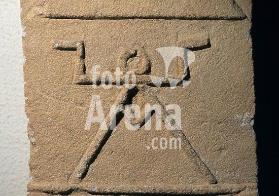 akg940727 Punisch, 4.Jahrhundert v.Chr.-Grabstele mit dem sog. Tanit-Zeichen.-Ausschnitt. Kalkstein, Höhe 51 cm, Breite 28 cm. Fundort: Tophet (Opferstätte des Baal-Hammon) in Sabratha (Tripolitanien, Libyen). Museum: Archäologisches Museum., FRANKFURT AM MAIN.