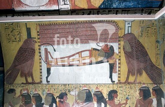 akg810103 El Kab (Upper Egypt), rock tombs, Tomb of Paheri (New Kingdom, 18th Dynasty, rule of Thutmose III, c. 1450 BC), west wall, northern stretch.-Funeral rites (detail): mummy of Paheri on a barque with two mourners in the form of Isis and Nephthys.-Relief, painted.
