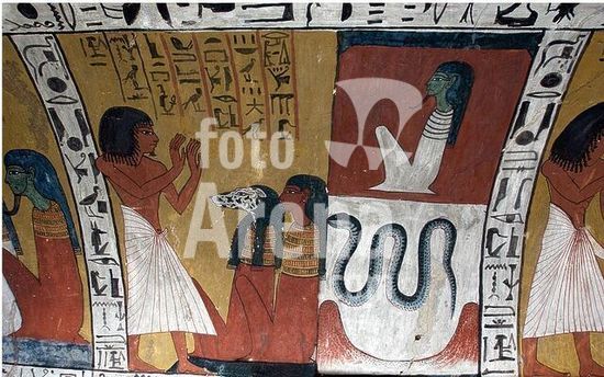akg867021 Egyptian, New Kingdom, 19th dynasty.-Horus and a deceased.-Wall painting from the tomb of a royal official. Western Thebes, Dra Abul'-Naga.