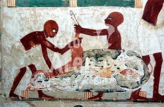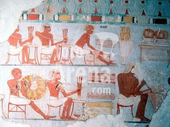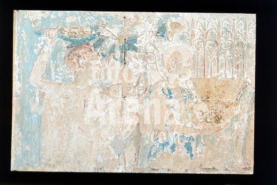 akg896003 Tuna al-Jabal-Hermopolis-West (Upper Egypt), tomb chapel of the High Priest Petosiris in the necropolis of Hermopolis (early Ptolemaic period, 2nd half of the 4th century BC).-Perfume makers at work.-Relief in the vestibule, north wall. Limestone, painted.
