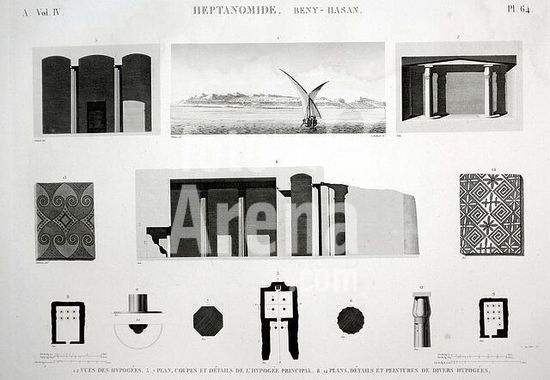 akg810211 Assijut / Assiut / Asyût (Oberägypten), Nekropole / Felsengräber.-"Syout (Lycopolis). / Plans, coupes, élévations et décorations hieroglyphiques de divers hypogées".-Kupferst. nach Zeichnung von J.B.P. Jollois (1776-1842) und Édourd de Villiers. Aus: Description de l'Égypte, Paris 1809 ff., A.Bd.IV, Tf.48. Museum: Private Collection., KAIRO.