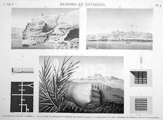 akg810064 Giseh (Ägypten), Pyramiden, (4.Dynastie, 3.Jahrtausend v.Chr.).-"Memphis / Vue des ruines, prise du Sud-Est" (Blick von Südosten über den Nil auf die Pyramiden; im Vordergrund Vermessung einer kolossalen Hand).-Kupferst. von Delignon nach A. Dutertre. Aus: Description de L'Égypte, Paris 1809 ff., A Bd.4, Tf.3. Ausschnitt. Museum: Private Collection., KAIRO.