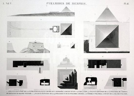 akg810124 Giseh (Ägypten), Pyramiden, (4.Dynastie, 3.Jahrtausend v.Chr.).-"Pyramides de Memphis / Vue de l'entrée de la Grande Pyramdie (..)". (V.li.Cheops-, Chephren-u.Mykerinospyramide).-/ Kupferst. von Schroeder nach François-Michel Cécile. Aus: Description de L'Égypte, Paris 1809 ff., A Bd.V, Tf.9. Museum: Private Collection., KAIRO.