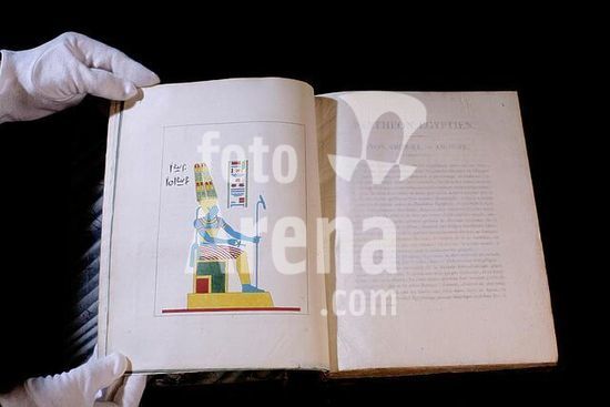 akg810052 Dendera (Ägypten), Hathortempel (ptolem. Zeit). /-"Dendera (Tentyris) / Vue perspective de l'intérieur du grand temple". (Innenansicht der Tempelvorhalle mit Hathorsäulen).-/ Kupferst., koloriert, von Sellier nach Prosper Jollois und Édouard de Villiers. Aus: Descripion de l'Égypte, Paris 1809 ff., A, Bd.IV, Tf.3a. Museum: Private Collection., KAIRO.