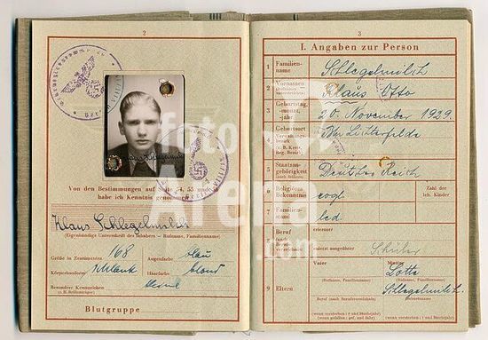 akg1783311 Militär / Wehrpass. /-Wehrpass der Deutschen Wehrmacht. (Deutsches Reich Gebrauchsmuster 1367174), Neudruck Berlin (Metten Co.) 1942. Vordruck, handschriftlich ausgestellt in Berlin-Schöneberg, 19. April 1944, auf den Schüler Schlegelmilch, geboren am 20. November 1929 in Berlin-Lichterfelde, gemeldet als ... Museum: Private Collection., Privatsammlung.