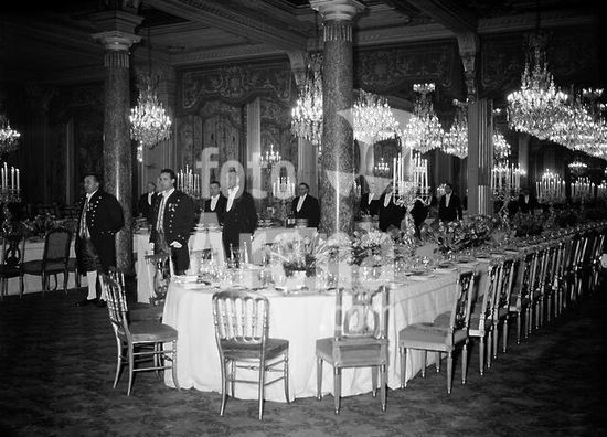 akg1128162 Paris (Frankreich), 8.Arr., Élysée-Palast-Palais de l'Élysée, Rue du Faubourg-Saint-Honoré 55-57 (vormals Hôtel d'Évreux; erb.1718-20; seit 1873 Amtssitz des franz.Staatspräsidenten), Festsaal / Salle des Fêtes (erbaut 1878-80; Arch.: Abel Chancel). /-Innenansicht des Festsaals vor einem Staatsbankett mit wartenden Dienern ...