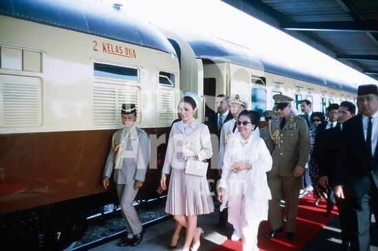 akg984967 Farah Diba, ab 1959 Gemahlin des Schahs Mohammed Resa Pahlewi, 1967-80 Kaiserin (Schahbanu) des Irans; geb. am 14.10. 1938 in Teheran. /-Staatsbesuch des Kaiserpaares in Malaysia, Januar 1968: Kaiserin Farah Diba mit der Königin von Malaysia bei der Abfahrt zur Halbinsel Penang mit dem Eastern & Oriental Express.-/ Foto.