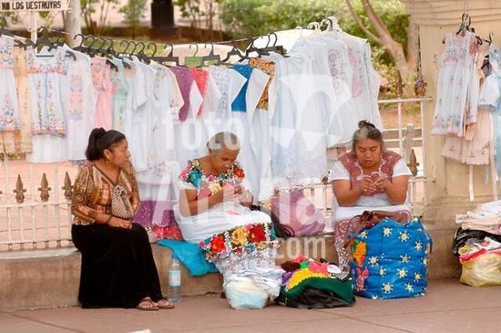 akg655628 Mexiko, Yucatan, Valladolid, Mayafrauen mit Kunsthandwerk am Hauptplatz.