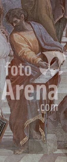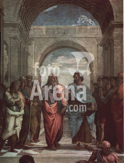 orz138302 Italian school. Detail of The School of Athens (Leonardo da Vinci as Plato and Aristotle).. Scuola di Atene . Vatican, Room of the Segnatura. Author: RAFAEL SANZIO O RAFAEL DE URBINO (1483-1520). Location: MUSEOS VATICANOS-ESTANCIA DEL SELLO. VATICANO.