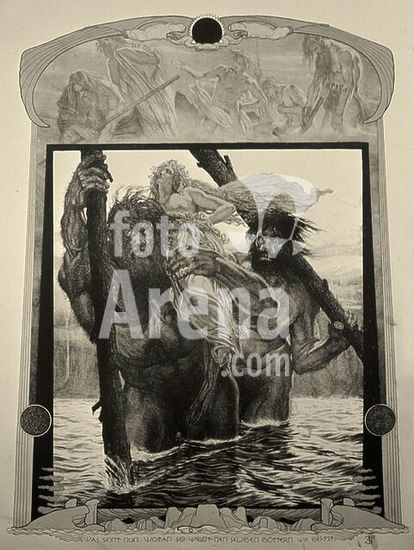 akg013516 Wagner, Richard Composer 1813-1883. Works: Das Rheingold (1854). Fasolt and Fafner kidnap Freia. Farblithograph, 1914, by Franz Stassen, 80 × 60 cm. Copyright: Additional copyrights must be cleared.