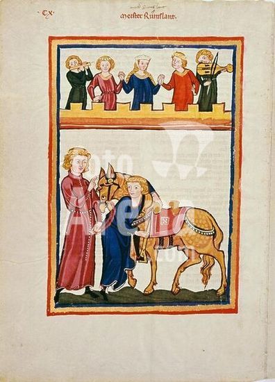 akg116730 Illumination, Zurich, c. 1310-1340. Master Rumsland of Saxony (active from 1273-1300) mounts a horse (a present?). From: Grosse Heidelberger Liederhandschrift (Codex Manesse). On parchment, 355 × 250 mm. Cod. Pal. Germ. 848 fol. 413v. Heidelberg, Universitätsbibliothek. Museum: Heidelberg, Universitätsbibliothek. Author: ANONYMOUS.
