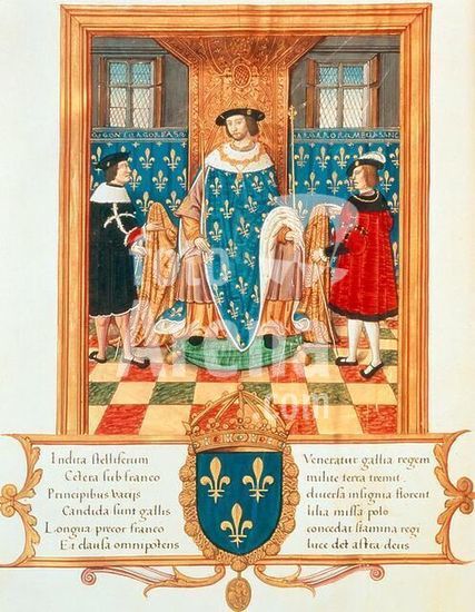 akg249079 Francis I., King of France (1515-1547), 1494-1547. Francis I. inbetween Erasmus of Rotterdam and Alberto Pio, Prince of Carpi. Illumination. From: Response of Alberto Pio of Carpi to Erasmus. Manuscript for Francis I.. Ms. français 462, fol. 1. Paris, Bibliothèque Nationale. Museum: Paris, Bibliothèque Nationale.