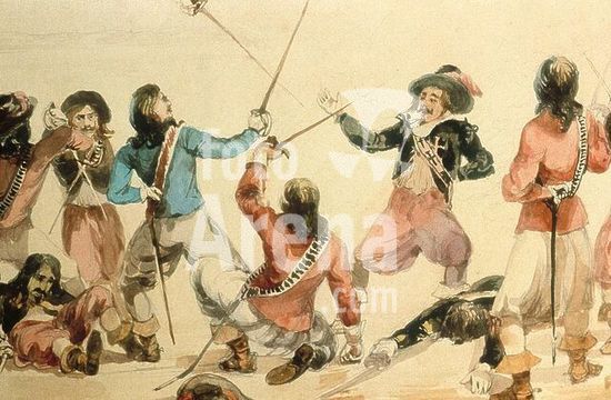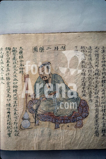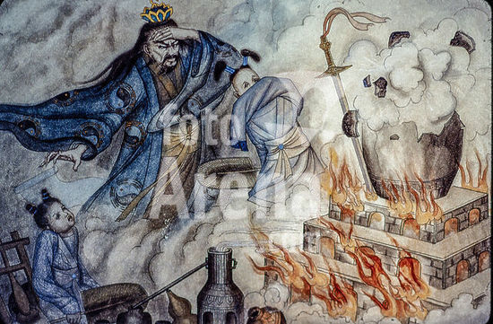 Chinese, 20./21. Century. - The invention of black powder. - (An alchemist in search of the elixir of immortality mixes sulfur, saltpeter and charcoal and accidentally invents the explosive black powder. One of the four great inventions of ancient China. Invented during the Tang Dynasty in the 9th century; first written record in the 11th century Century). Illustration.
