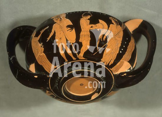 akg3003716 Griechische Vasenmalerei, attisch, rotfigurig, klassische Zeit, Werk des Eretria-Malers, um 425/420 v.Chr. - Hektor und Paris bereiten sich auf den Kampf vor (Von links Kassandra mit Weinspende, Hektor, Paris, Apollon, Hekabe). - Kantharos, Seite B (Seite A: Die Gesandtschaft der Griechen in Troja). Ton, gebrannt, schwarz bemalt, mit ausgesparten roten Figuren, Höhe 13,2 cm, Durchmesser des Randes 17,5 cm. Fundort: Gravina di Puglia (Apulien, Italien), Botromagno, Grab 1. Inv. Nr. Ta 177009. Gravina di Puglia, Fon. Pomarici Santomasi. Museum: Gravina di Puglia, Fondazione Pomarici Santomasi.