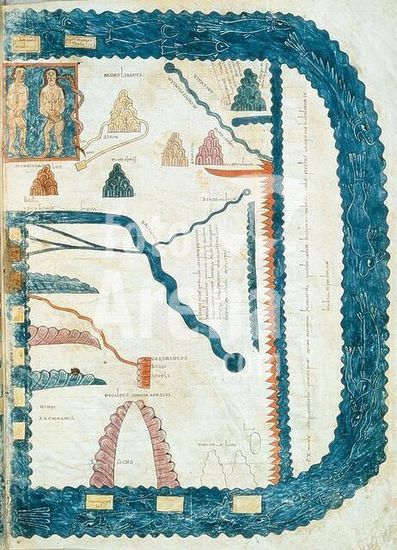 akg328674 Geography / World Maps. World map, right half. Illumination, mozarabic, Monastery S.Salvador de Tábara, Emeretrius (Monk) and End (Nun), 975. From the Beatus of Gerona (Beato de Liébana, In apocalypsin commentarius - Apocalypse commentar. 786). On parchment, 400 × 260 mm. Ms. 7 (11), fol. 55 r, Gerona, Museo Capitular de la Catedral. Museum: Gerona, Museo Capitular de la Catedral. Author: ANONYMOUS.